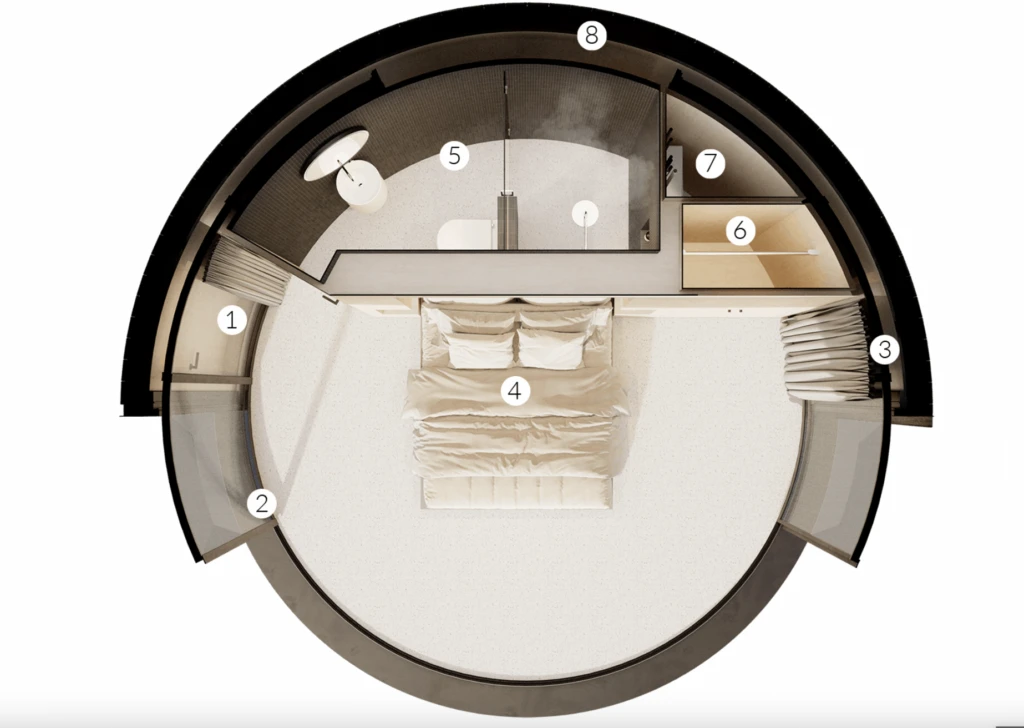 Bautizada LumiPod, tiene una estructura curva diseñada alrededor de una ventana de 5 m de diámetro que se puede deslizar por rieles y abrir al exterior.