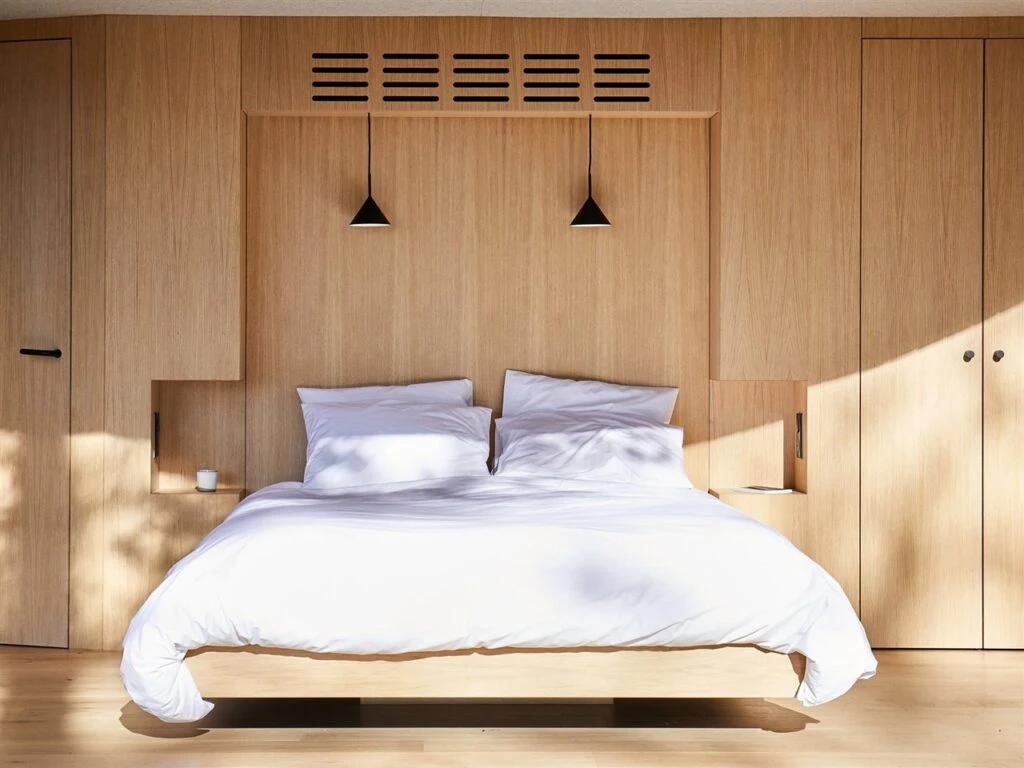 Los interiores son simples pero muy cálidos. El suelo es de roble natural y el techo está cubierto con una tela de fieltro de lana merino. El baño con azulejos consta de un inodoro, una ducha y una bacha.