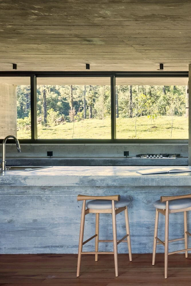 Internamente, el gris del hormigón contrasta con el verde del paisaje y con el calor del suelo de madera de reforestación. Un gran panel de vidrio ininterrumpido ocupa uno de los lados de la casa, disolviendo las barreras entre el interior y el exterior, y haciendo que la casa no sea solo un mirador para la naturaleza, sino parte de ella.