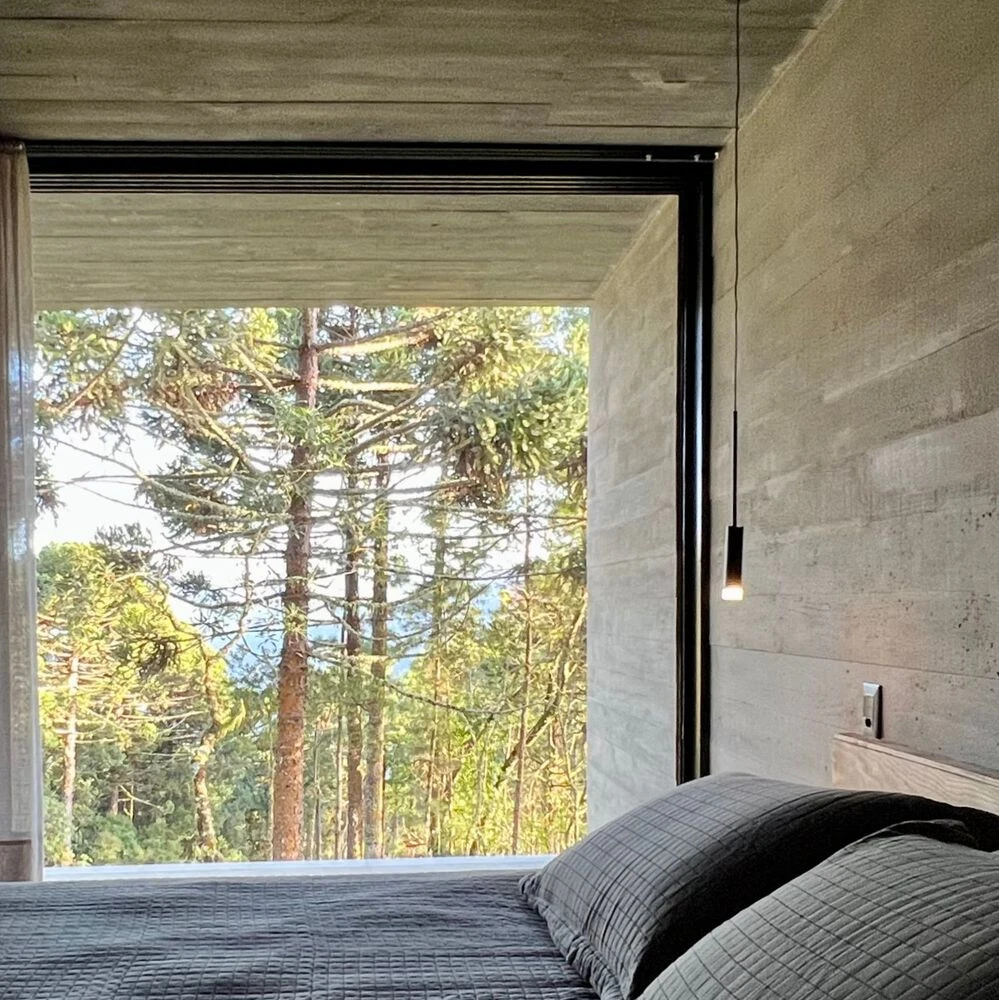 Implantada en una generosa área de tierras, con más de 20 mil metros cuadrados, caracterizada por una topografía bastante accidentada y por un hermoso bosque de araucarias (una especie de pino brasileño amenazado de extinción), la casa fue diseñada para que sus formas no intentaran competir con la belleza de tan perfecta naturaleza.