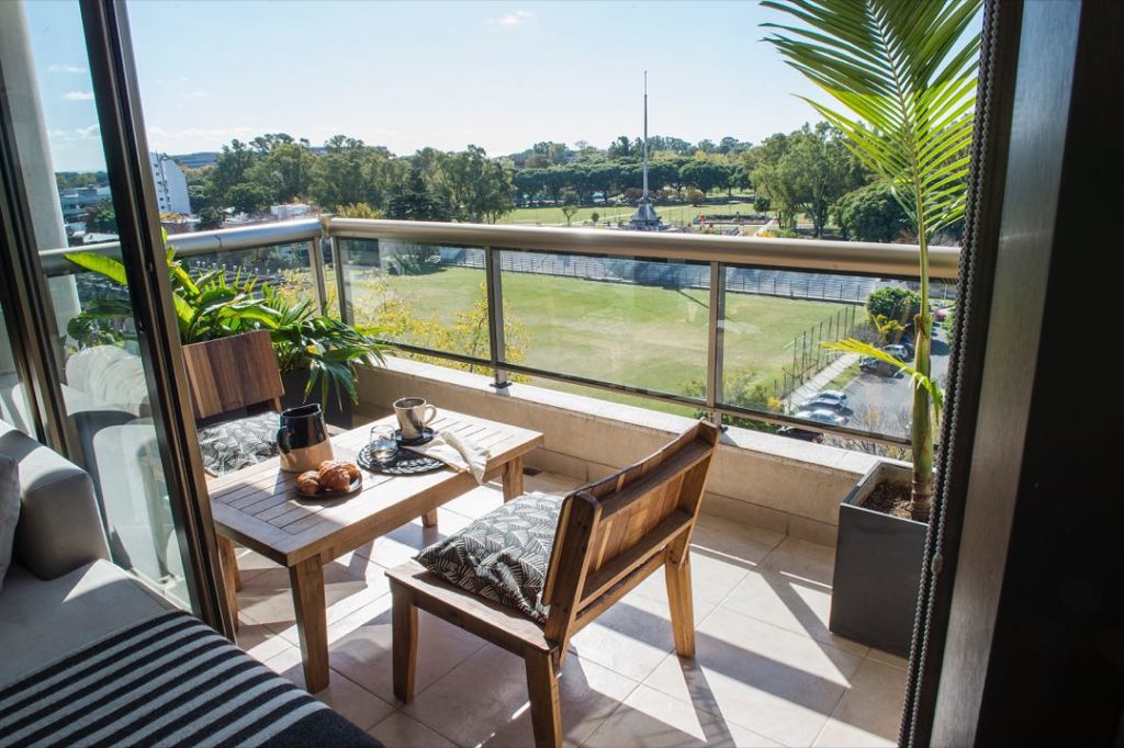 Tres mesas que dan la nota en la decoración de este depto. La de centro, es un tronco de madera natural con vidrio (@landmark). En un lateral del living, sorprende una consola de madera quemada negra (@selvanegra) que suma una escultura de cuerpo femenino (@estilo.planta) y un florero con ramo de gran tamaño (@franzflower). Y en el recibidor, da la bienvenida una consola con batea en madera rústica (@lacapinteria.ba) con un florero de vidrio con dos orejas de elefante.