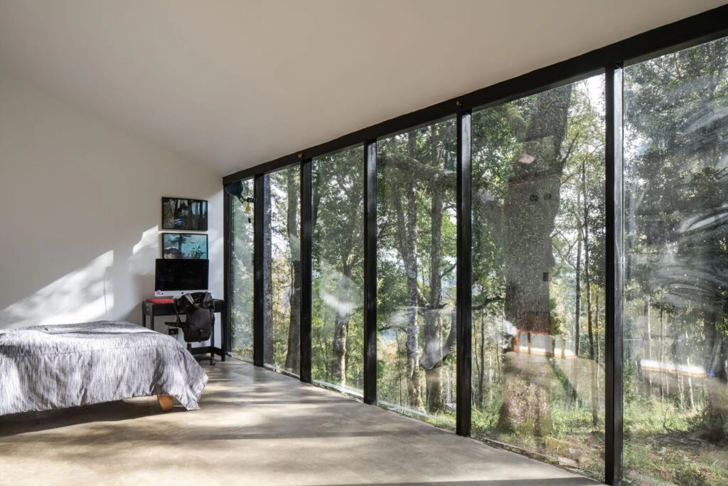 Y precisamente por esa razón es que una de las caras del proyecto es completamente vidriada, logrando así un "roce" entre el interior doméstico y el exterior boscoso.