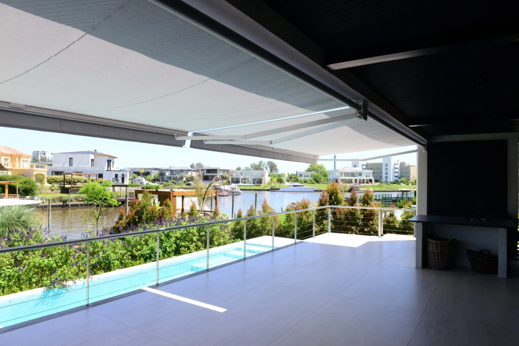 Para una buena protección de los rayos del sol y mantener los interiores de la casa más frescos es fundamental elegir un toldo alta performance. En esta vivienda, se instalaron toldos Proyectantes de Hunter Douglas, con el objetivo de cubrir la amplia superficie exterior y lograr sombra al mediodía. Los mismos están fabricados con una innovadora técnica de juntas soldadas: en lugar de estar cosidos, los paños de tela se sueldan.