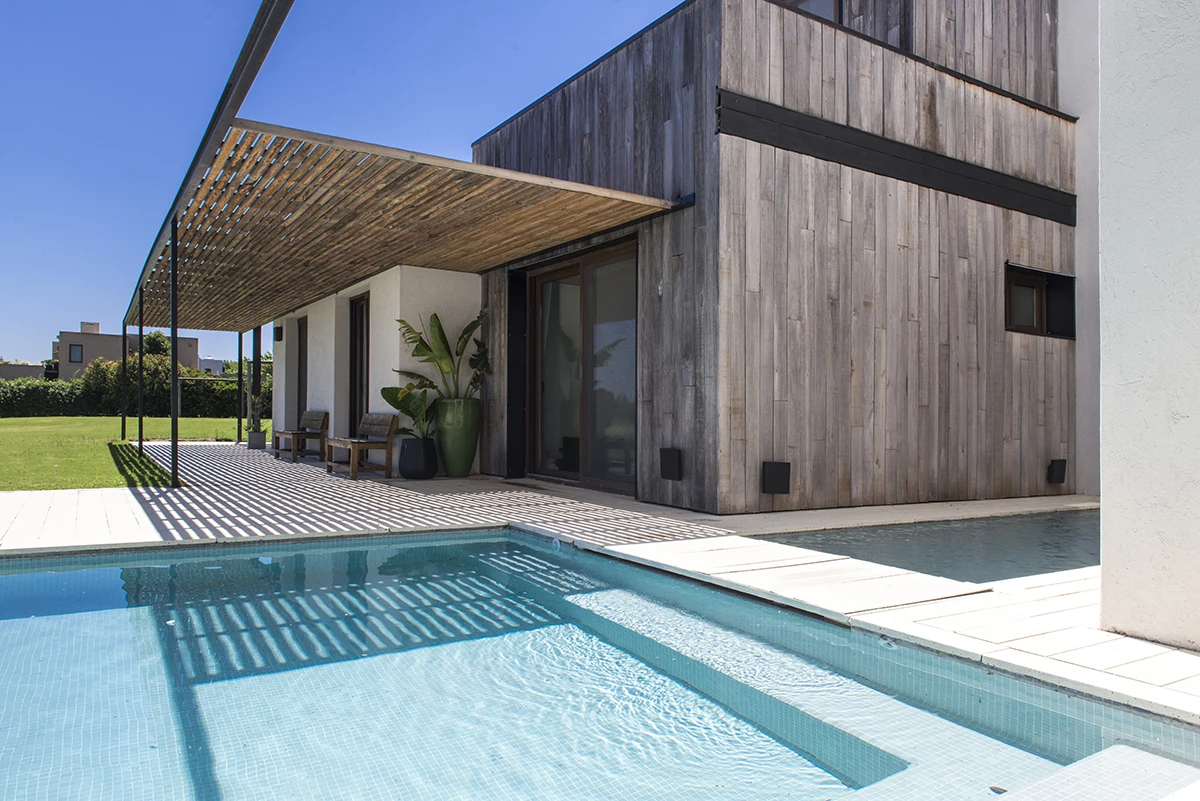 Una casa modernísima, con dos espejos de agua que se funden con la laguna, lucarnas verticales que bañan las áreas centrales de luz natural, una galería que abraza y contiene proponiendo distintos sectores con vista al jardín y un diseño interior impecable pero pensado para una vida simple -sin lujos ni excentricidades- y lo más sustentable posible.