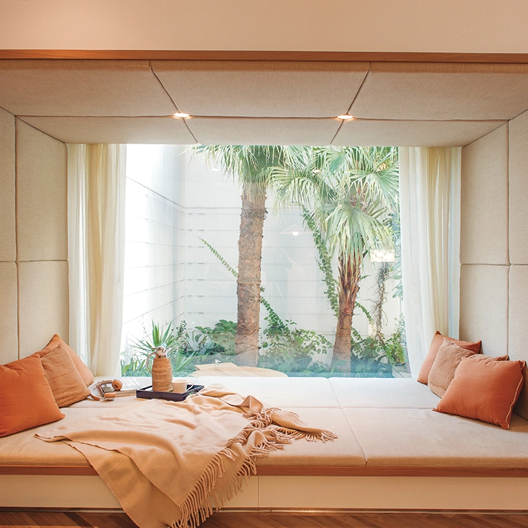 El diseño japonés dice presente en una suerte de tatami resuelto contra un gran ventanal con diseño tipo bow window. Allí, una estructura de madera y una cómoda colchoneta proponen rincón mágico y privado destinado al relax.