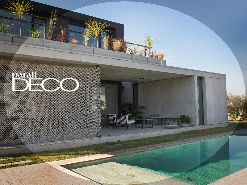 La fachada de esta casa diseñada por el estudio de Ezequiel Amado Cattáneo (@studio_acarqs) propone un bloque inferior revestido con tabiques de hormigón y otro superior tapizado en un siding cementicio pintado con latex exterior color negro mate.