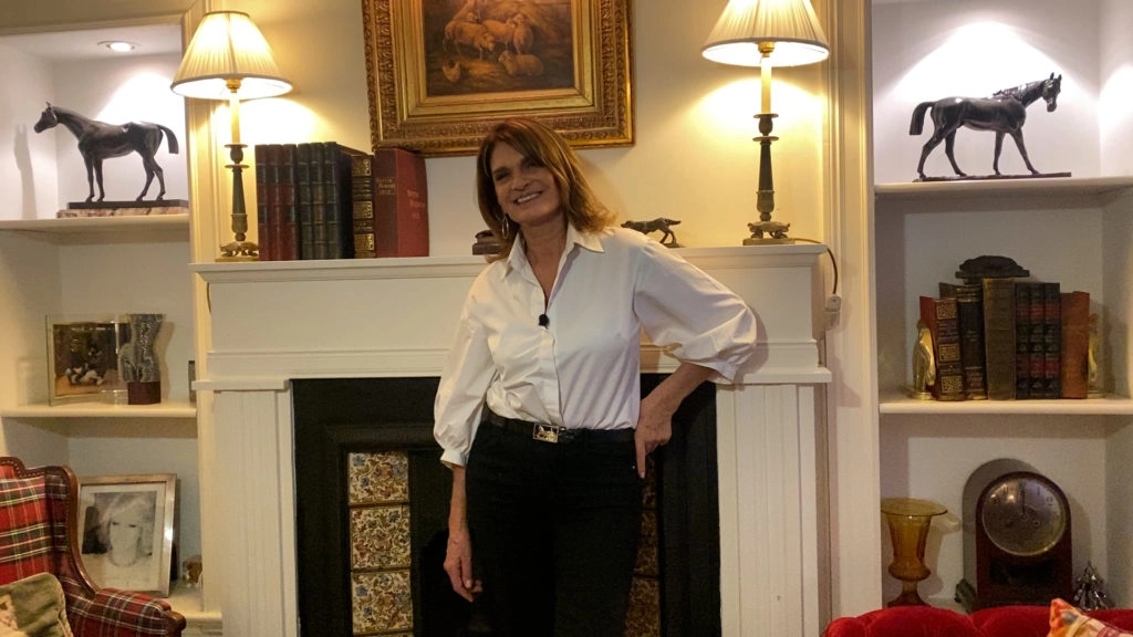 Los retratos familiares y de ella en su juventud cobran protagonismo en la estantería que rodea la chimenea. El hogar está adosado a la pared del living, tiene columnas de yesería en blanco y sus costados están revestidos de cerámica con flores de colores. Su amor por los caballos se ve reflejado en los diferentes objetos deco que componen este espacio.
