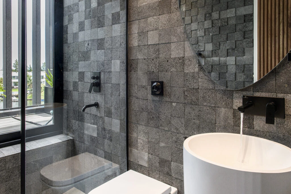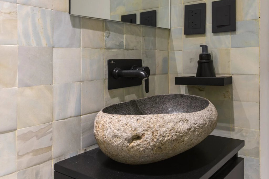 Si bien la variedad de tamaños y colores ofrece la posibilidad de crear diseños únicos, ABC Design Stone también propone nuevas formas de aplicación que se destacan por su particularidad. Por ejemplo en el baño del último piso, en donde el revestimiento de las paredes se realizó con piezas de piedra Black Lava de 10x10 cm con un diferencial muy particular: se colocaron de forma irregular, logrando un relieve que hace aún más interesante el espacio.