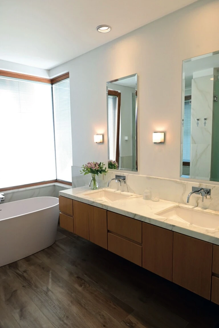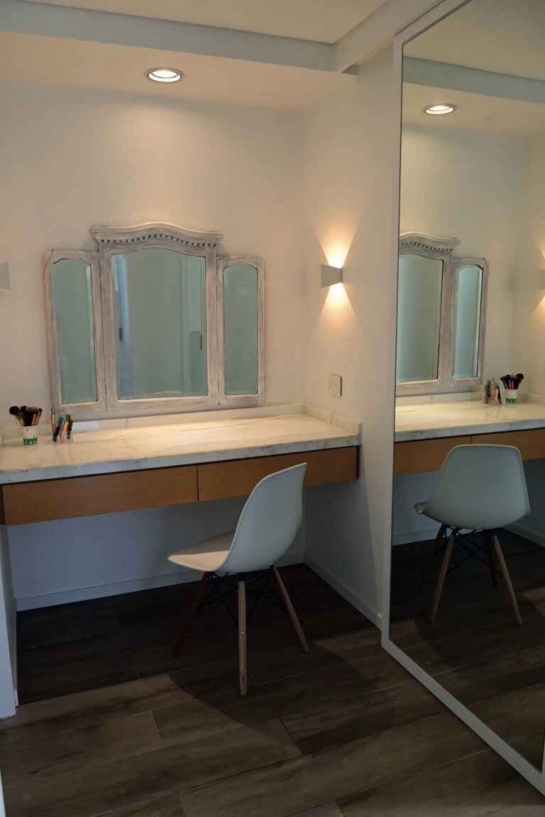 En el antebaño se dispuso un pequeño espacio de make up con mesa y espejo vintage. El baño principal cuenta con mueble de roble americano, mesada de mármol Carrara, manteniendo la coherencia material del proyecto.