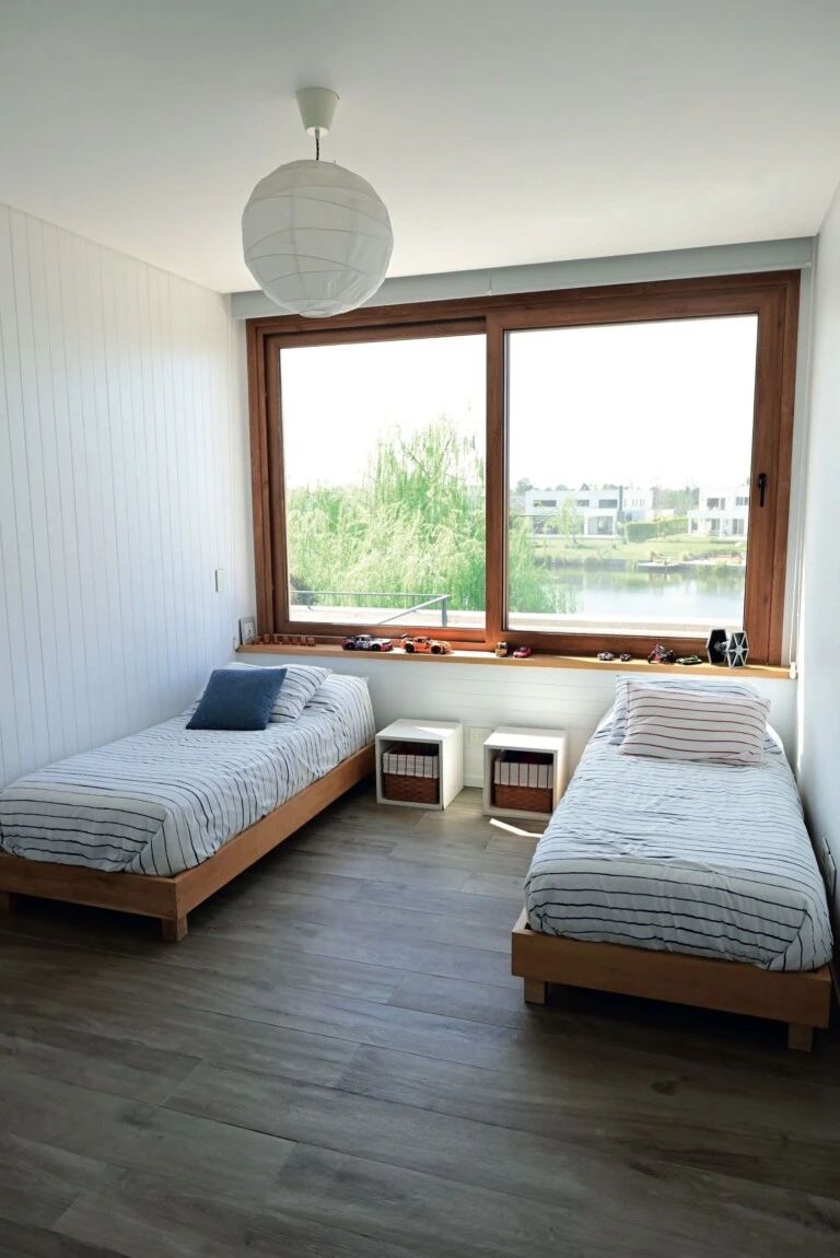 Un tercer dormitorio incorpora dos camas y cajoneras blancas como mesas de luz centrales. En todos los casos, los grandes ventanales con marco de PVC símil madera aportan luz natural y vistas abiertas.