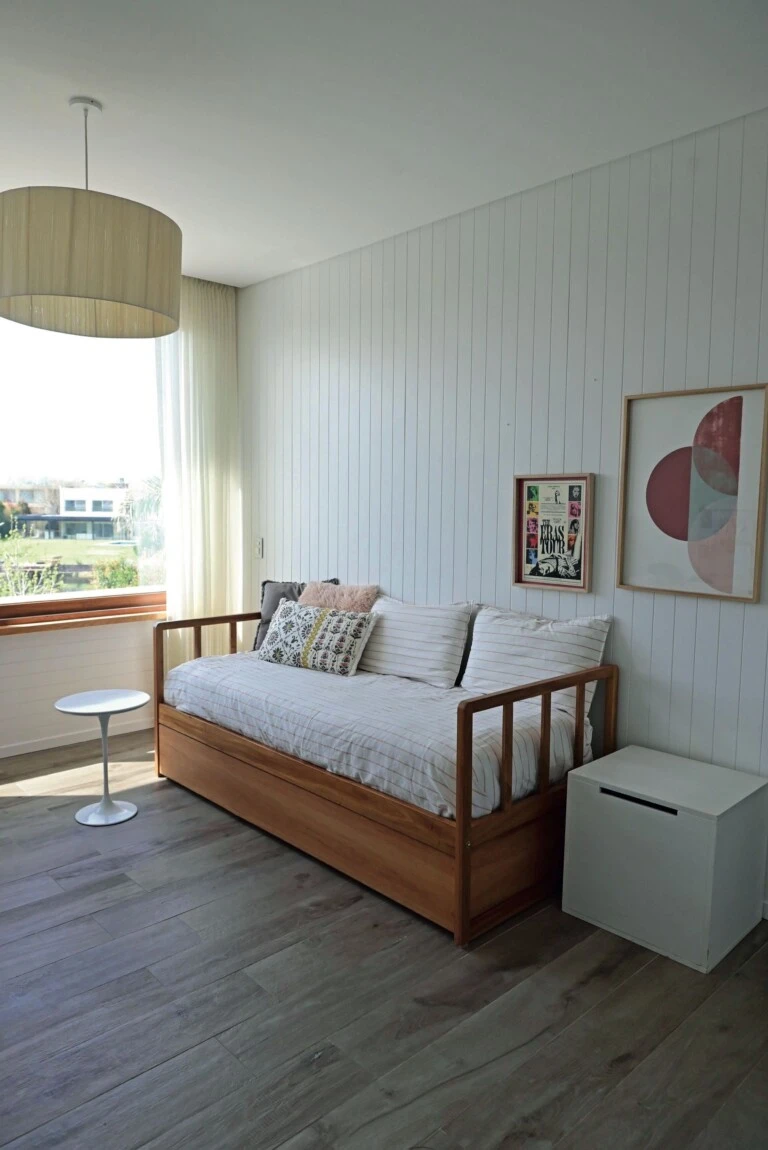 El dormitorio de la niña presenta una cama en madera de petiribí contra una pared revestida en MDF ranurado blanco laqueado y decorada con cuadros.