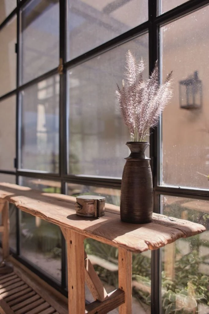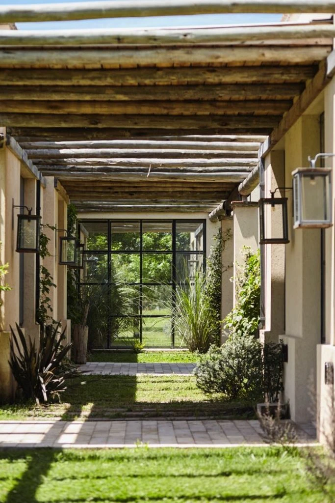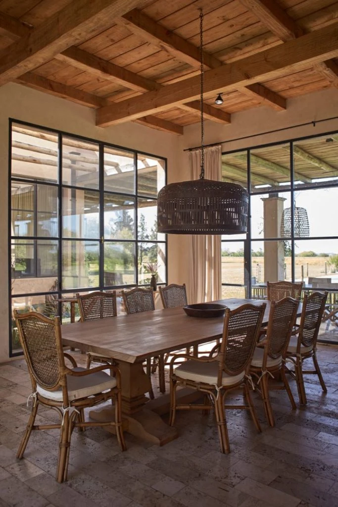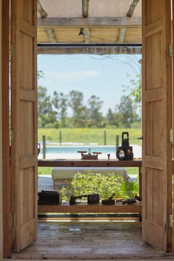 Una gran puerta de madera de incienso se abre y nos invita a entrar al Chaja. Y un ventanal del piso al techo permite disfrutar el verde y la vista abierta hacia la pileta de la chacra.