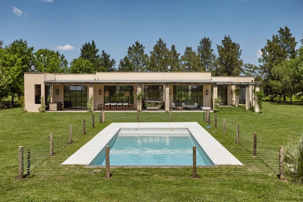 Vistas de la pileta y la parte trasera de la casa, protagonista de la chacra durante encuentros familiares y con amigos.