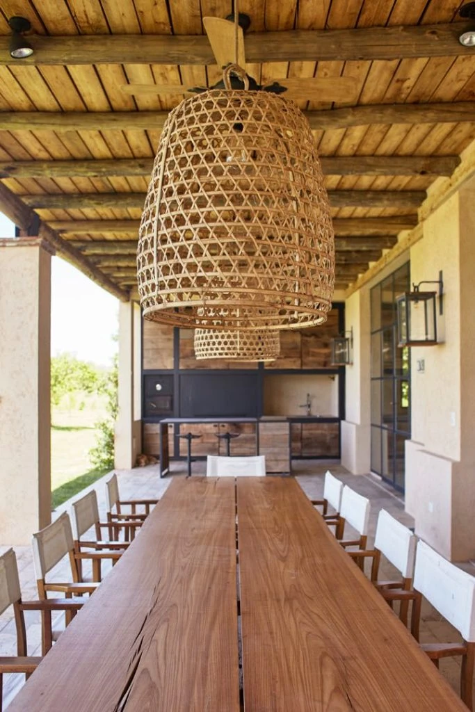 Galería con parrilla con frente revestido en listones de madera recuperada. Techo de galería y pérgola de Eucalipto sin cepillar. Una gran mesa con tablón de madera de Petiribi y caballetes. Sillas de directorio (La Maceta).