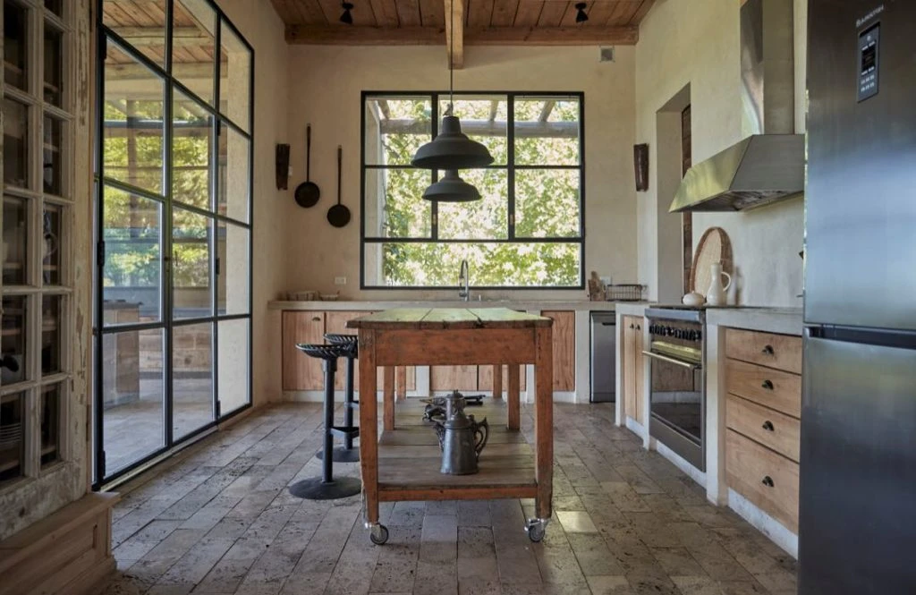 En la cocina, un mesón antiguo de Pino Oregon traído de un campo de Villa La Angostura. Las banquetas de hierro son de estilo industrial, hechas con asiento de tractor. Mesadas de microcemento con frentes de bajo mesada de madera rústica, igual que el resto de las maderas de la casa, sin ningún tipo de terminación ni protección. Todo al natural.