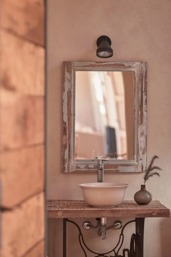 Al toilette se accede a través de una puerta corrediza de maderas recuperadas. La bacha fue hecha a pedido (Taller de Lu) apoyada en un mueble realizado con una antigua mesa de coser y espejo de madera restaurado.
