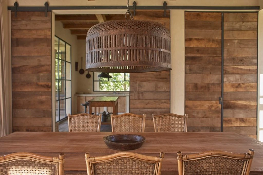 En el comedor, una mesa de madera de Petiribi hecha a medida con sillas de ratán y lampara de hierro, todo importado de Indonesia. Las puertas corredizas que conectan con la cocina son de madera recuperada.