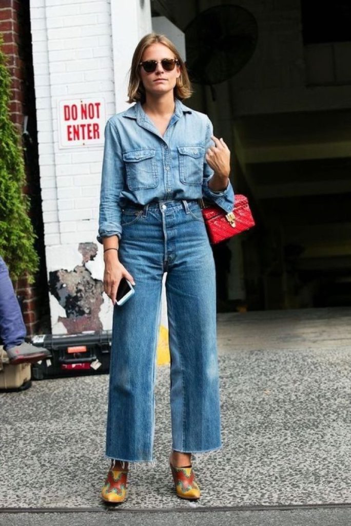 Con un look total denim, lo ideal es llevar accesorios de color, regla que aplica sobre todo a carteras y zapatos.