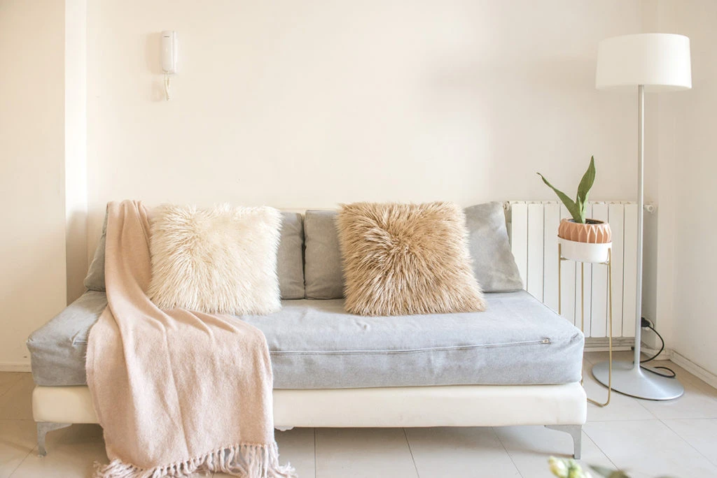 La ropa de cama y almohadones son de @blanquitahome. Y las luminarias -velador y lampara de pie- de @IMDI.