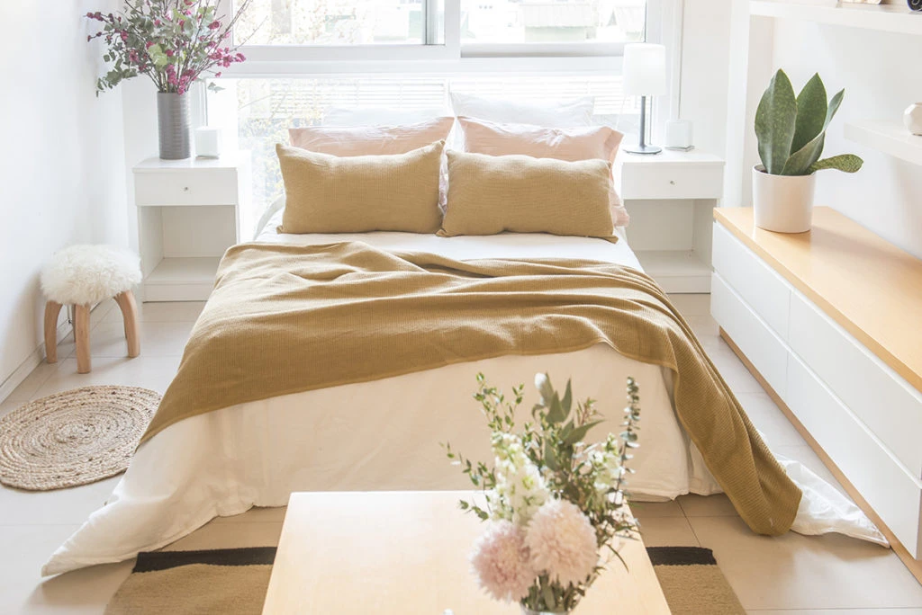 La cama permite dividir el monoambiente en 2: dormitorio por un lado, y estar y cocina, por el otro. Las banquetas son modelo tolix con almohadones de piel de @jblacroux. Más floreros y ramos de @piuavanti_flowerbox.