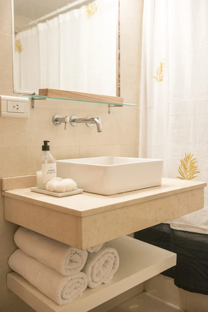Cortina de baño de gasa combinada pintada a mano de @claraboiaandco. Los accesorios de baño son de @co_casaorganizada.