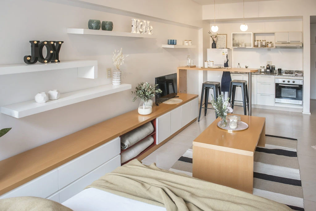 Y detalla: “Otra clave del ambiente es el mueble, además ser la primera vista del departamento, resuelve todo el guardado. Así, el espacio queda unificado con esta pared continua de estantes y modular de guardado en sentido longitudinal”.