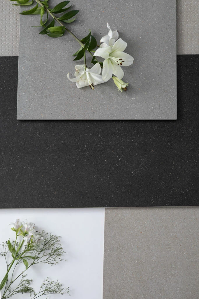 La referencia para los diseños exclusivos de Le Parc Punta del Este Torre IV fue la línea MATRIX de ILVA Porcellanato. La serie se caracteriza por sus terrazos milimétricos, que permiten involucrar diversas texturas. Al respecto de la colaboración con la marca, el arquitecto explica: “ILVA nos permite adaptar el color, puntualmente, para que sea el diferencial de acuerdo a la paleta que nosotros planeamos para este edificio Le Parc IV”.