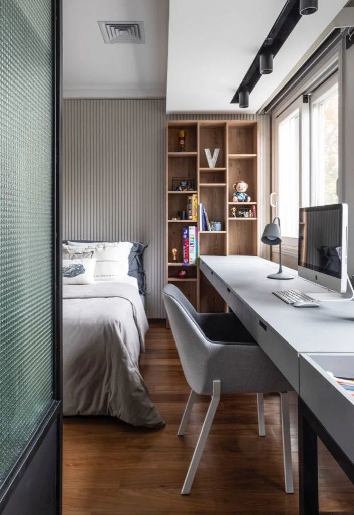 La propuesta se completa con un escritorio lateral realizado en melaminas de Egger y hierro. En la cara opuesta, un placard con puertas en un revestimiento laqueado en forma de varillas (De Otro Tiempo).