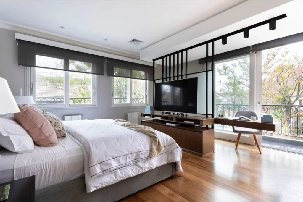 Un módulo de hierro y vidrios texturados (@deotrotiempo) se planta en el centro de este gran dormitorio para darle contención a la tevé y crear un espacio para ropa del día y accesorios en la cara que da a un vestidor, todo con diseño de Arenal Estudio (@arenalarq).