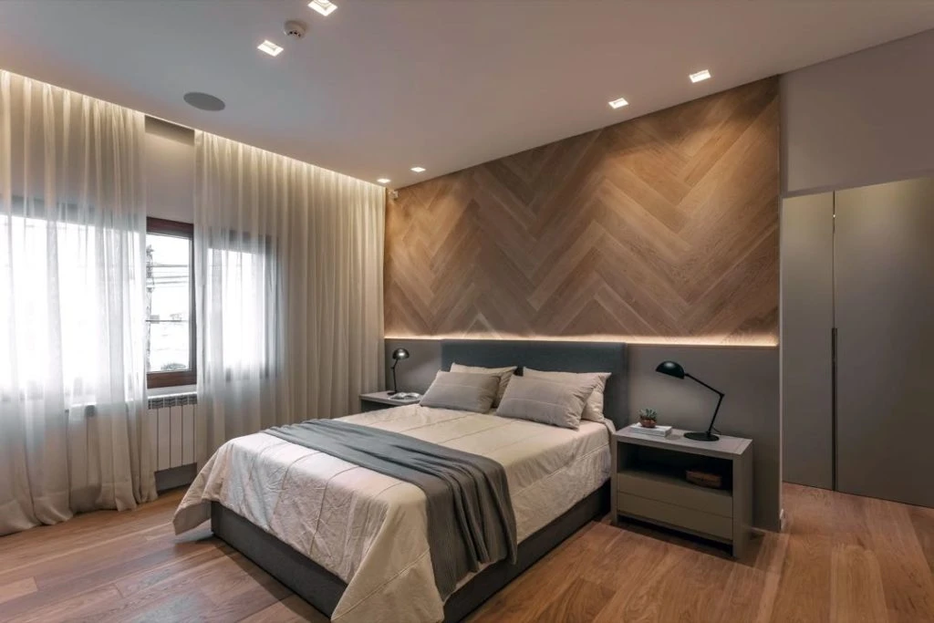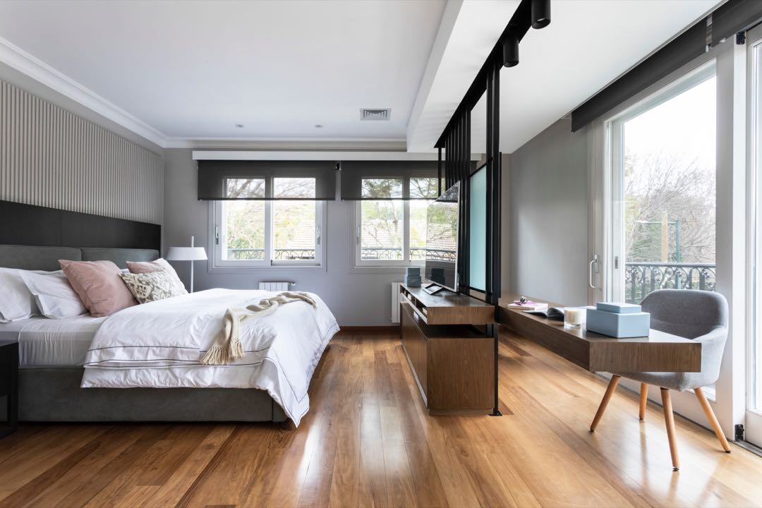 Este dormitorio en tonos grises y roble, diseñado por el estudio de Judith Babour (@estudiojudithbabour) tiene como protagonista a la media pared revestida en madera puesta en forma de espina de pescado, que acompaña al respaldo y a la faja inferior laqueada en gris con un vivo en madera de roble: un detalle que se repite en todos los dormitorios de esta casa. La cama en tono gris oscuro realza en contraste con el panel laqueado.