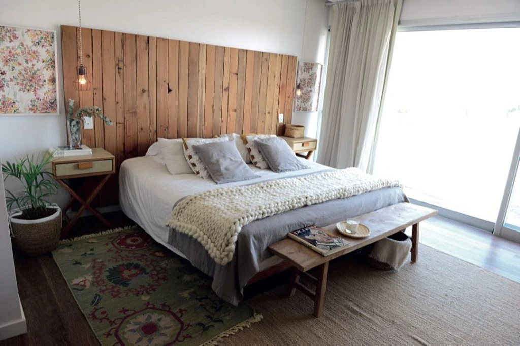 Los bancos pieseros son un recurso que queda muy lindo. Le dan mucha calidez al dormitorio y un corte al tamaño de la cama.
