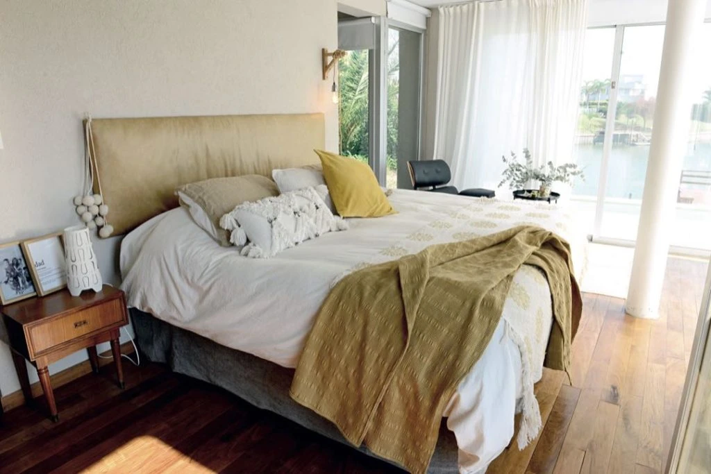 Tonos ocre para este dormitorio con ventanales de piso a techo y cortinas de gasa en color crudo (@holarenatahome). La cama remata en un respaldo de cuero dulce de leche, que combina con los almohadones en diferentes texturas (arpillera, tejidos), el cover duvet en lienzo rústico y el cubre somier stonewashed (@holarenatahome).