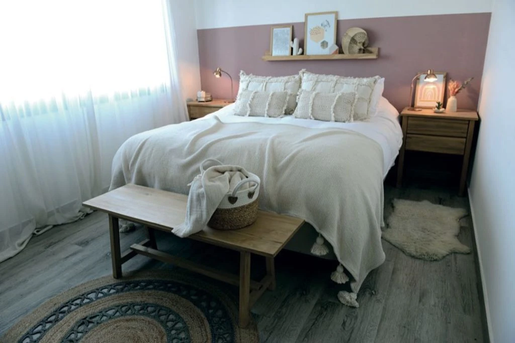 Una pared en color rosa viejo (tono Bermellón, de Quimtex) le da personalidad a este dormitorio cálido. Tiene mesas de luz de álamo teñido con dos cajones y un banco a los pies de la misma madera(@solpaloudeco) con un cesto de yute y soga.