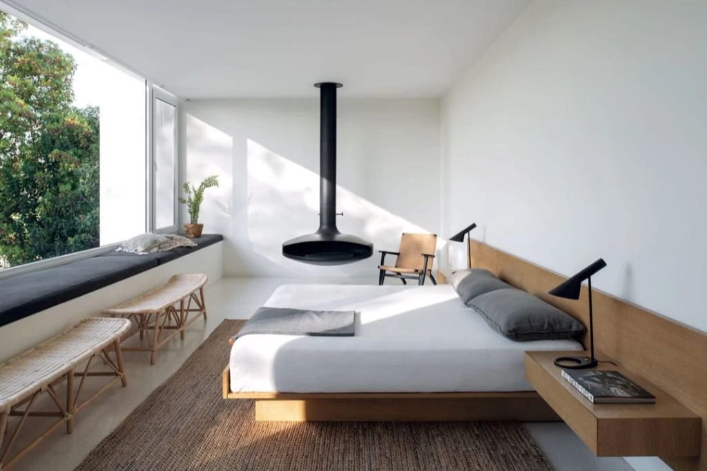 La austeridad es protagonista en este dormitorio de una casa de fin de semana, con interiorismo de Jorge Muradas y arquitectura de Fabián Parra.