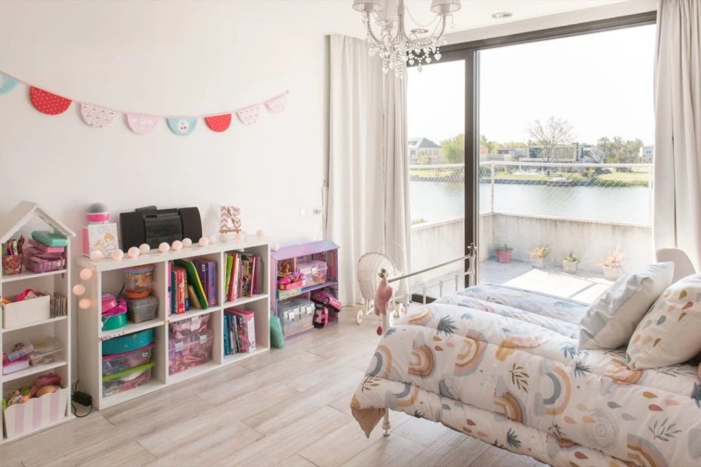 El dormitorio de una niña, en suite, con terraza a la laguna. Para ella se eligió una cama vintage de hierro en color blanco, con un simpático acolchado y almohadones de @tintachini, como en los demás dormitorios.