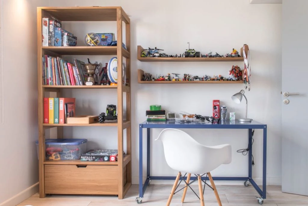 3.Es importante crear una zona de “estudio” en el cuarto; un escritorio tanto para la tarea, como la lectura y el juego. Tiene que estar bien iluminado, y mejor si incluye biblioteca para sumar espacios de guardado.