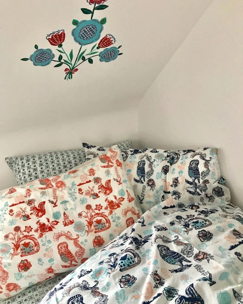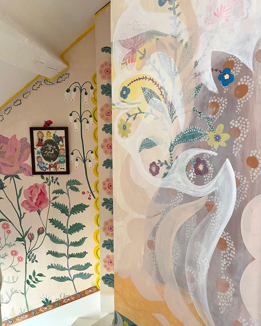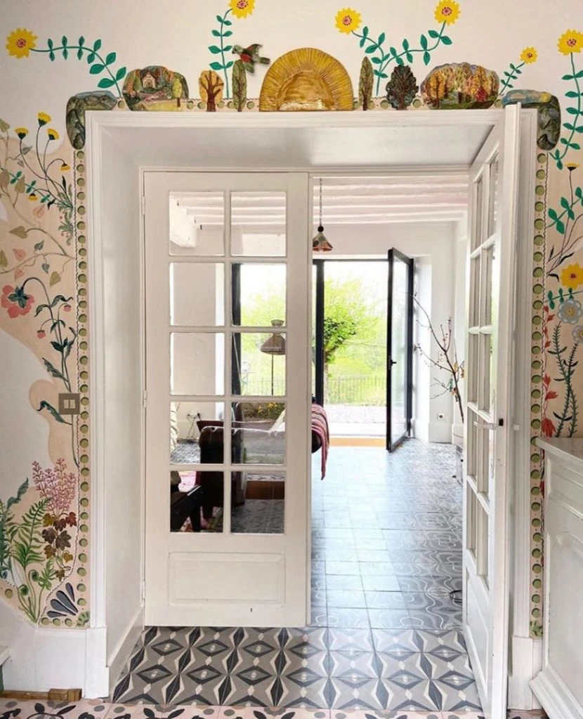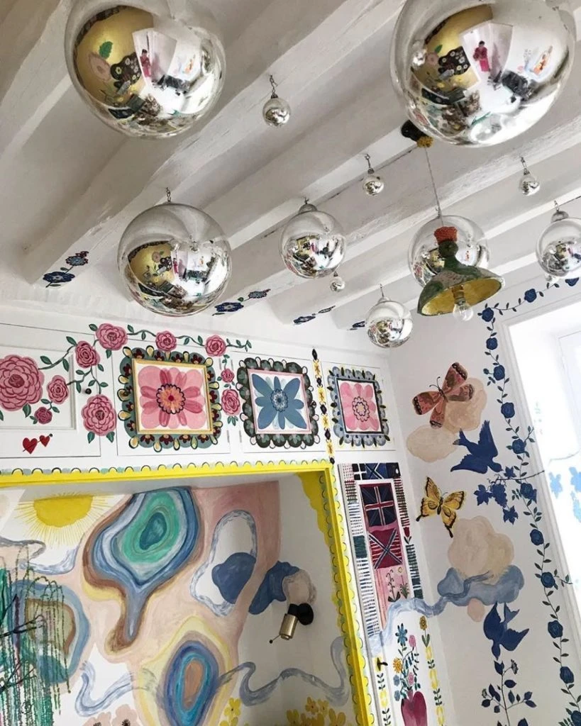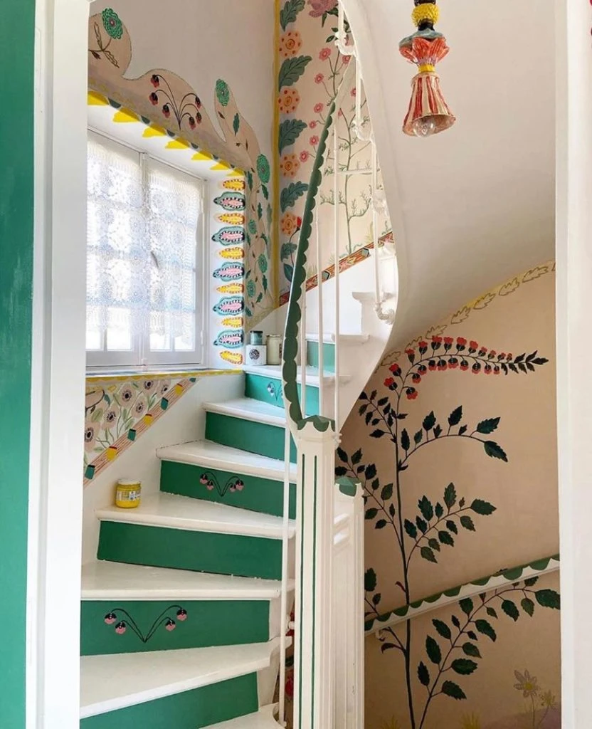 Cuando comenzó a decorar su cabaña, Lété tenía la intención de guardar sus fantásticas pinturas en el espacio de su estudio. Sin embargo, una vez que Francia entró en un encierro, su esposo la animó a pintar. Ahora, Lété pasa cada día agregando motivos especiales, una flor, un pájaro o un estampado de jazz, en cada rincón y grieta.