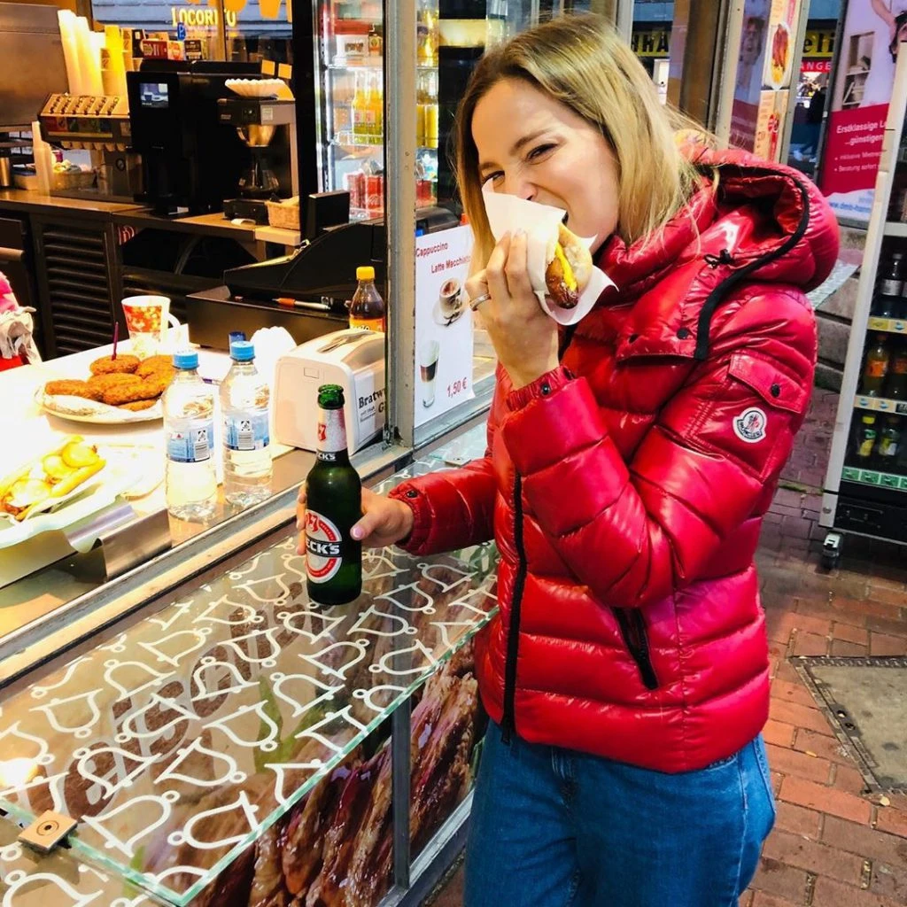 Luisana se dio el gusto de saborear un pancho y una cerveza en Hannover (aunque eran las 10 de la mañana). Foto: Instagram.