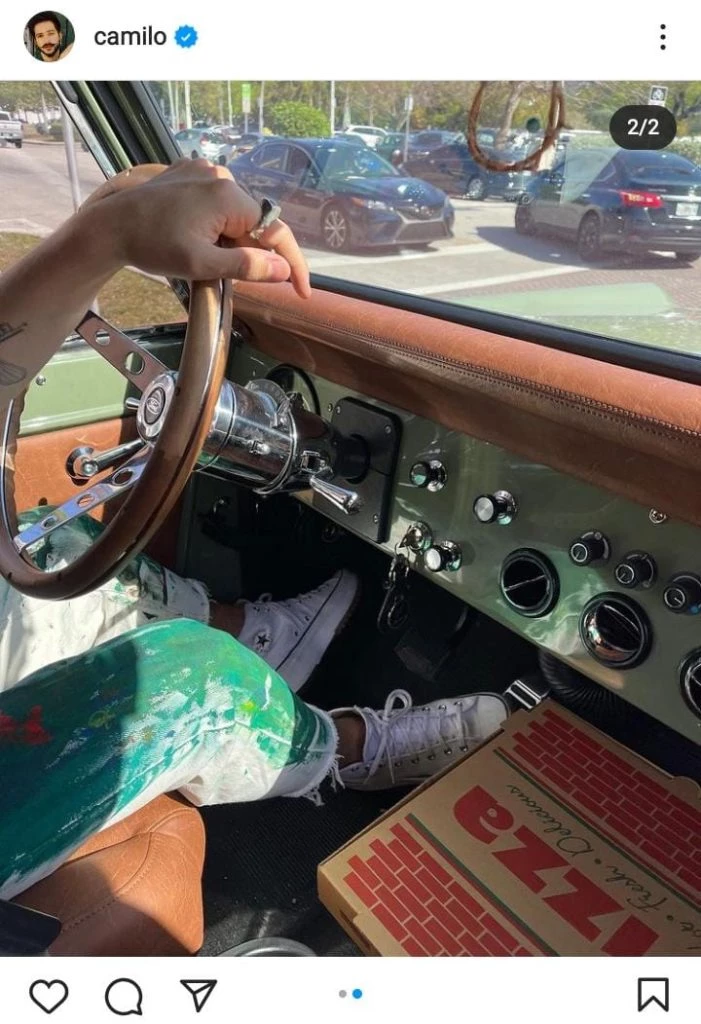 En la imagen que compartió Camilo se lo puede ver conduciendo su vehículo con una gran sonrisa y mostrando qué le pidió Evaluna. "Mi esposa quiere pizza", escribió en su posteo súper feliz de poder complacer a la madre de su hijo.
