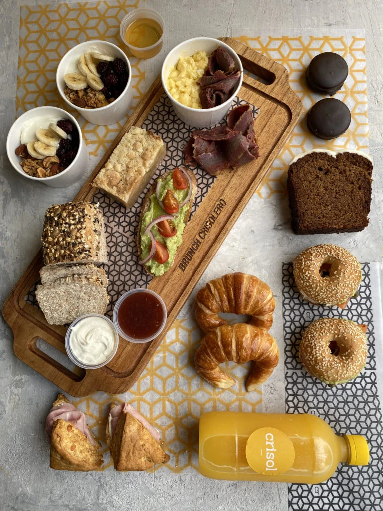 Incluye minipan de molde multisemillas con queso crema y mermelada casera, yogurt con granola, cuadrados dulces, scons de parmesano con queso crema con jamón cocido, bagel de salmón, alfajores y tostón de palta y tomates. @crisolcafeterias