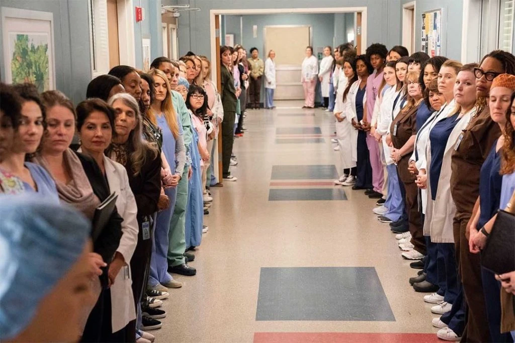 La escena más emotiva del capítulo es en la cual las mujeres del hospital forman dos filas para brindarle contención y apoyo a la víctima mientras camina hacia el quirófano. Además de las actrices y extras, en esta toma participaron maquilladoras, guionistas y la propia Rhimes. #NoEstásSola.