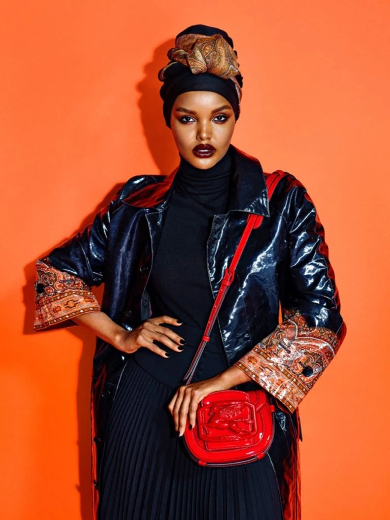 La presencia de la top Halima Aden es una expresión concreta de que la inclusión fue parte de la búsqueda y concepto de esta campaña. La top model nacida en Kenia llevó su cartera con un abrigo acharolado con puños estampados y un turbante en su cabeza.