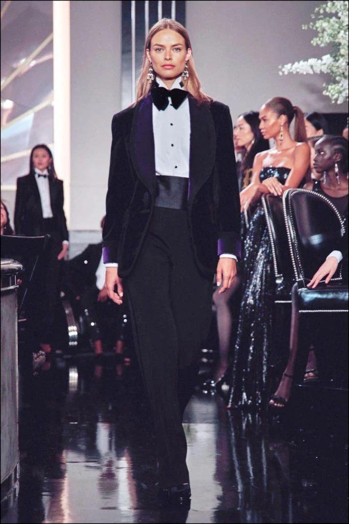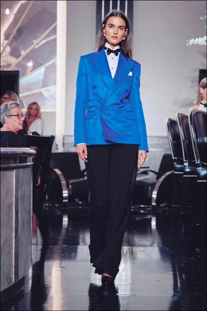 Ralph Lauren reversionó el esmoquin femenino con sacos de silueta al cuerpo, en colores brillantes contrastado con pantalones de corte amplio.