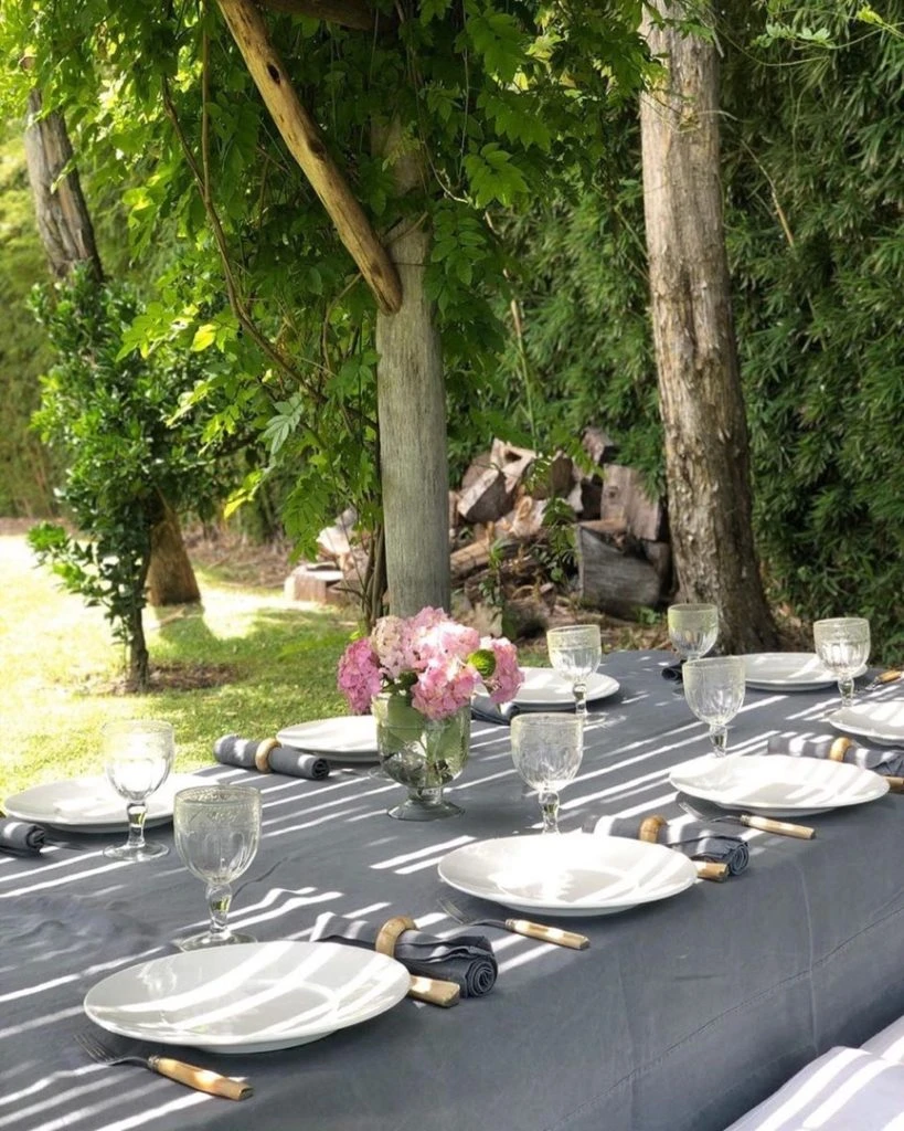 Fiel a su estilo, Juliana Awada decoró la mesa de domingo con lo último en tendencias: flores de su jardín. La exprimera dama mostró en su cuenta de Instagram la mesa puesta al aire libre, lista para servir el almuerzo. Se destacan el mantel y las servilletas de lino en tono gris claro, uno de sus preferidos, color que se repite en algunos de los almohadones.