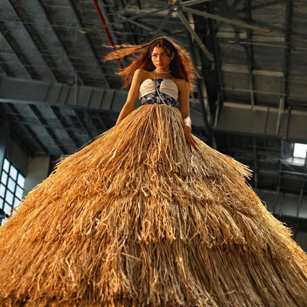 Sobre algo parecido a una choza tribal, hecho con una estructura de hierro y paja, Zendaya posó para una producción de fotos. Se convirtió en una pieza de arte viviente. El trabajo artístico fue obra de Simone Leigh y busca empoderar a la mujer afroamericanas.