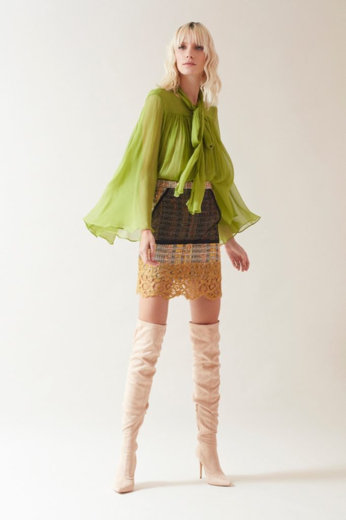 Blusas de gasa con mangas acampanadas se combinaron con faldas mini elaboradas con varias texturas.