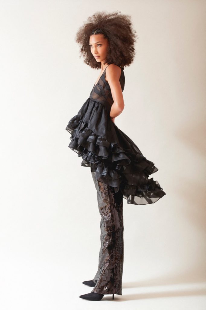Para la noche, se proponen tops con ruedos irregulares se combinan con pantalones anchos de lentejuelas.