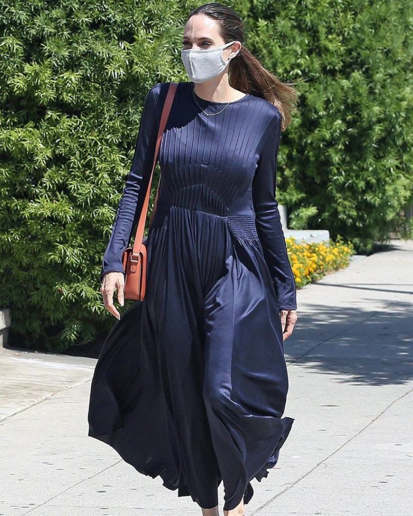 En los últimos días, la actriz se dejó ver como nunca. A diario sale a hacer las compras con las calles de Los Ángeles con barbijo y acompañada por sus hijos. Esta vez llevó un vestido de noche que lo convirtió en un estilismo casual gracias a unas sandalias chatitas.
