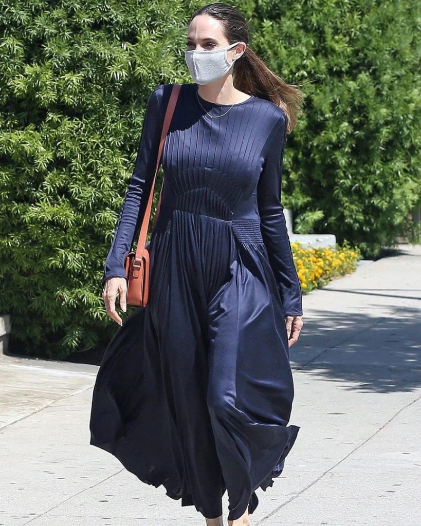 El vestido de jersey de seda, con mangas largas, cuello cerrado y la falda hasta el tobillo lleva todo el frente plisado. Súper elegante, se convierte en la opción perfecta para usar de noche en una cena especial. Angelina supo hacerlo más casual combinándolo con sandalias bajas.
