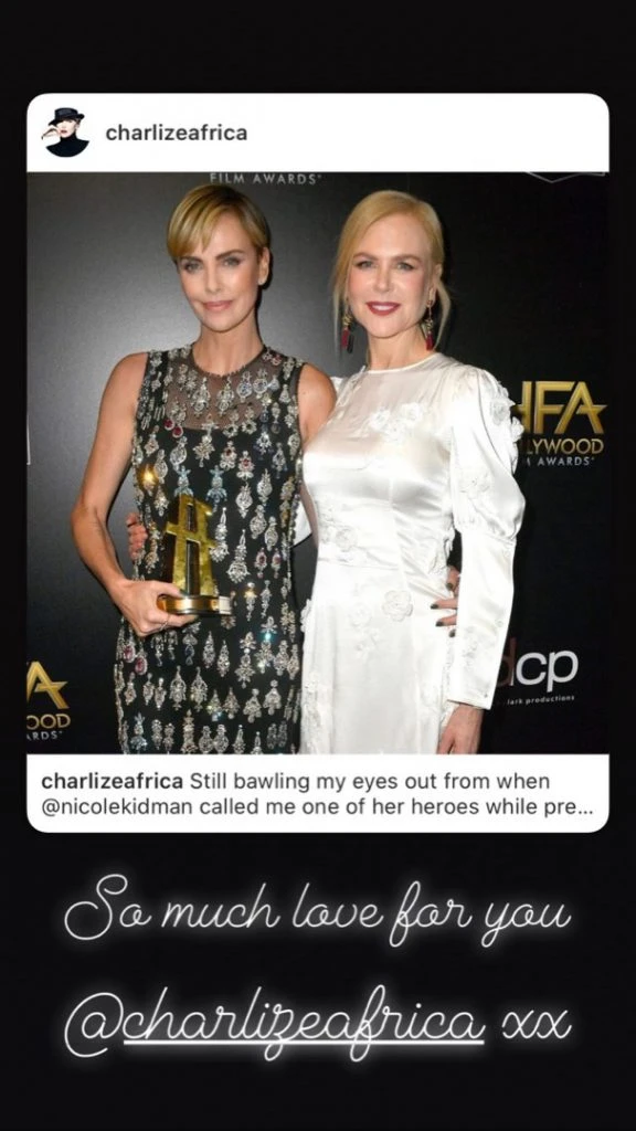 Nicole Kidman le entregó el premio al Logro de Carrera a Charlize Theron en la gala de los Hollywood Film Awards. Pero antes le dedicó unas palabras que conmovieron a todos los presentes y obviamente a la propia Charlize.